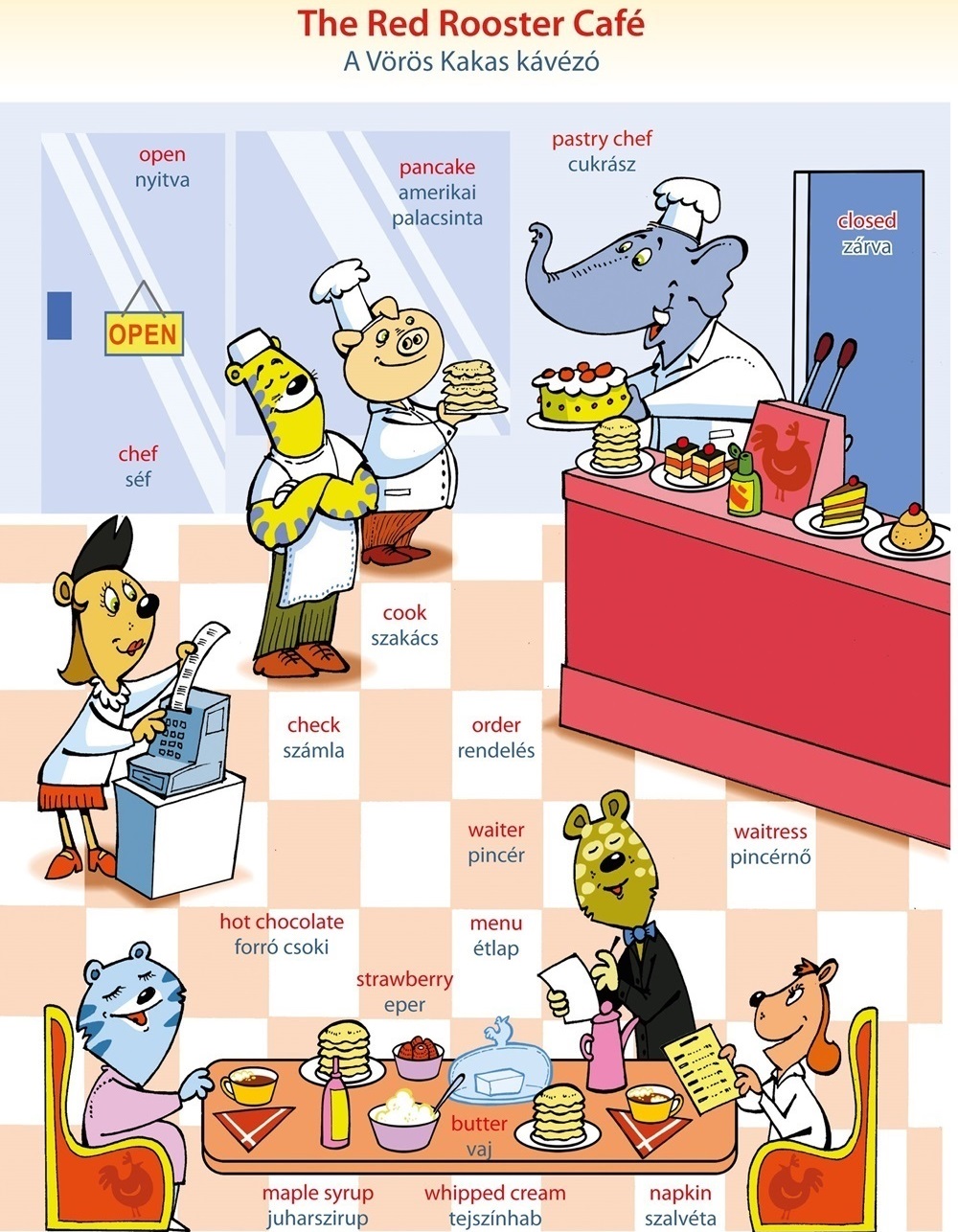 Anna és Emma egy New York-i kávéházban reggeliznek. Amerikai palacsintát és tejszínhabos forró csokit rendelnek. A palacsintát juharsziruppal, vajjal, friss eperrel és tejszínhabbal tálalják a Vörös Kakas Kávézóban.