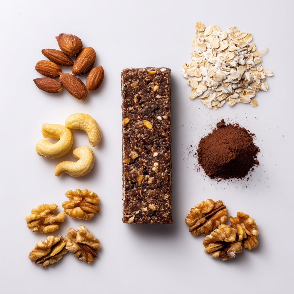 egy bögre aprított dió, egy bögre apróra darált zabpehely, egy bögre puha, mag nélküli datolya, egy evőkanál kakaópor (natúr, nem édesített).